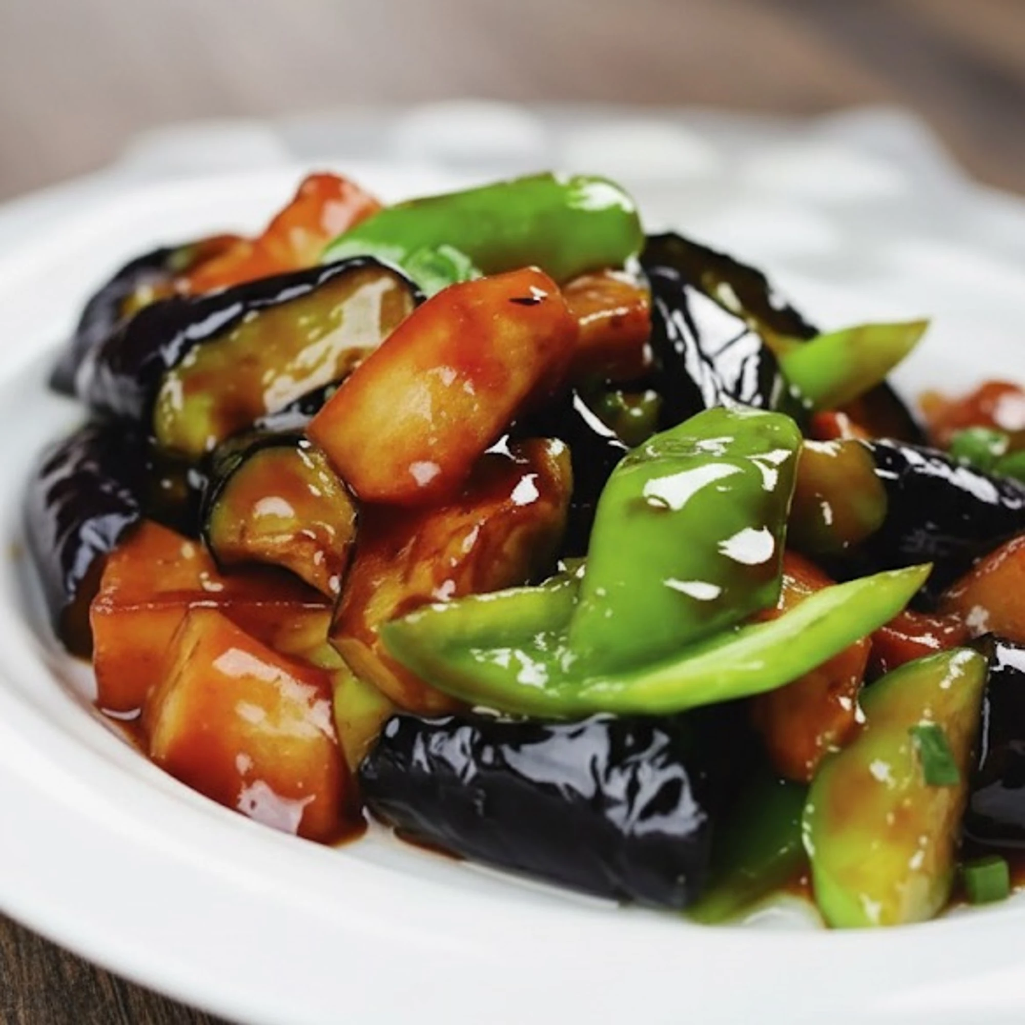 Genießen Sie unseren gebratenen Kartoffeln, Auberginen und Paprika in einer delikaten Austernsauce. Ein klassisch-vegetarisches Gericht, das mit seiner reichen Textur und seinem ausgewogenen Geschmack begeistert.